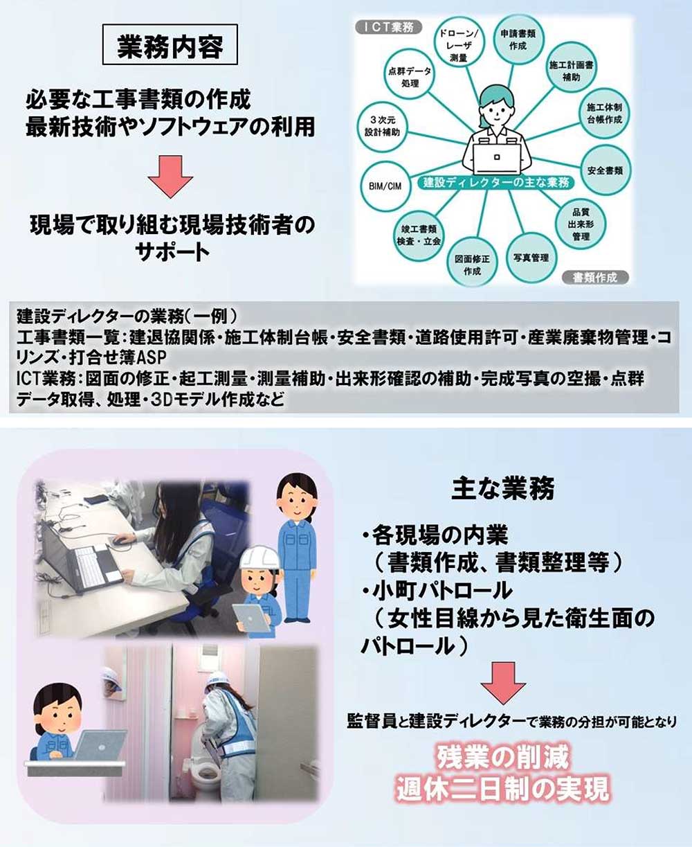 そして残業の削減だけではなく、週休二日制の実現に向けて現場技術者のサポートを担う「建設ディレクター」の育成にも熱心に取り組んでいます。